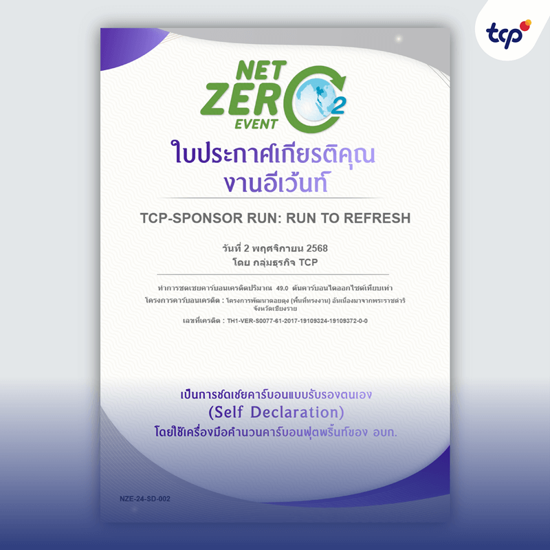 TCP-SPONSOR RUN: RUN TO REFRESH赛事于2025年11月2日在国家体育场(Supachalasai Stadium)举办,活动获可持续发展合作伙伴GC YOU Turn鼎力支持,将使用过的透明PET塑料瓶回收并进行高效循环再利用。该赛事还获得自我认证的零碳足迹荣誉证书,使用曼谷温室气体管理局(TGO)碳足迹工具核算碳排放,充分彰显天丝集团将环保理念深度融入活动运营的坚定承诺,通过减碳排、优管理、循利用的全方位举措,持续为社会与环境创造可持续价值。