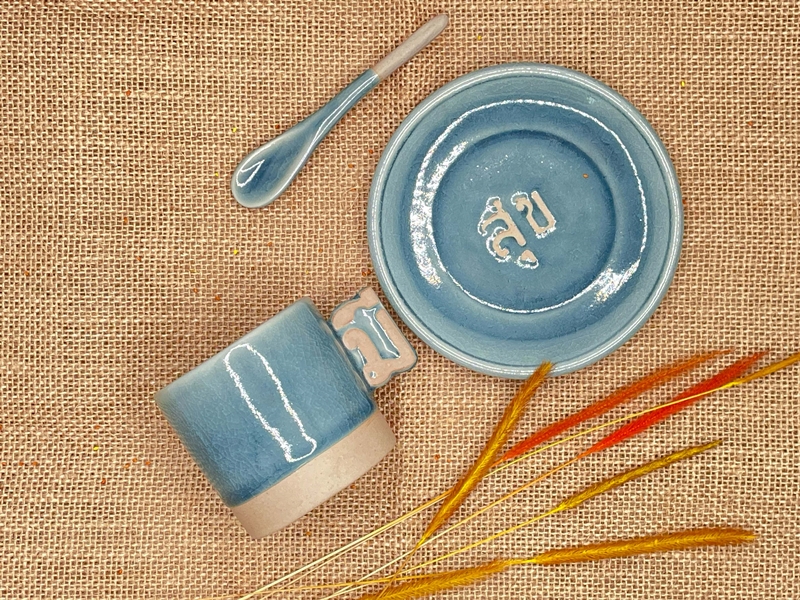 “Mee Sook” Celadon coffee and saucer set from Chiang Mai. The word “Celadon” is derived from a French word whereas it is called “Sankalok” ceramicware in Thai. It has been registered an intellectual property as well as considered a “Geographic Indication (GI)” product line. Chiang Mai Celadon products are stoneware glazed with plant-based ashes mixed with rice paddy topsoil. After glaze firing, the products then turn signature Celadon-green, exuding its classic beauty for the world to embrace.