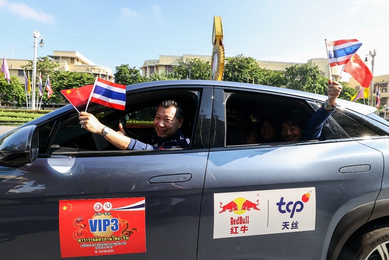 As a landmark event marking the 50th anniversary of China–Thailand diplomatic relations, the Friendship Caravan will embark on a 5,000-kilometer transnational journey. Starting from Bangkok, it enters China through Phitsanulok Province and the China-Laos border port of Mohan–Boten, passing through Xishuangbanna, Kunming, Guiyang, Zhangjiajie, Xi 'an and Pingyao, and finally arrives in Beijing. The entire journey takes 16 days. Supported by a “Sponsorship Alliance” of leading China–Thailand enterprises, including TCP Group and BYD, at about 8:15 AM, the friendship caravan slowly passed through the arched balloon door one by one. On-site staff presented commemorative gifts to the participants, and tourists in the vehicle waved the Chinese and Thai flags. The atmosphere was very lively. The convoy then passed by Bangkok's landmarks such as the Grand Palace and Chinatown, and took group photos along the way, leaving a vivid imprint on cross-border people-to-people exchanges throughout its journey.
